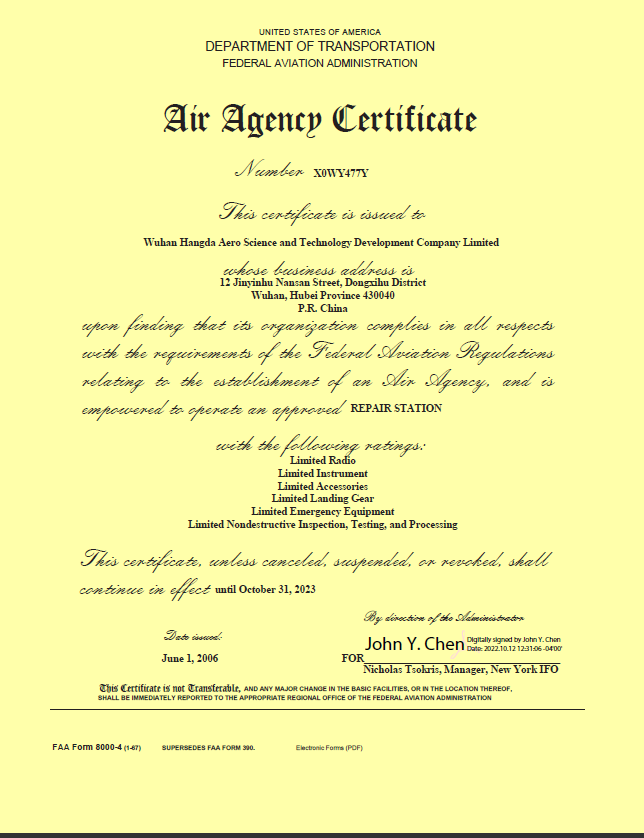 2006年6月 公司獲得FAA維修許可證。